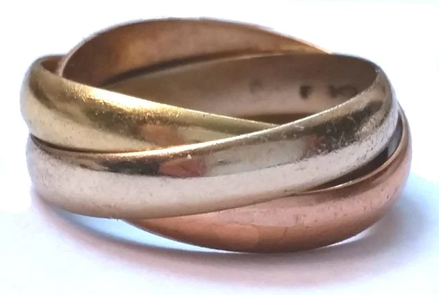 My husband Victor’s and my love of the interesting and unusual extends even to our ‘Russian wedding ring’ selection. We sport his and hers versions of a tri-colored design of intertwined rings of white-gold, yellow-gold and pink-gold. I like to think of the three interconnected rings as symbolic of Father (yellow gold), Son (pink gold) and Holy Spirit (white gold).